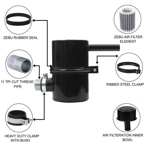 Inlet air fiter for resiprocating Air compressor. Heavy duty product painted with special Epoxy black industrial paint. Suitable from 3 HP to 20 Hp air compressor